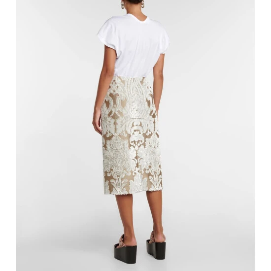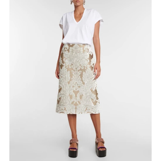 For your next event, opt for this pencil skirt from Dries Van Noten as an alternative to the cocktail dress. The brocade design is woven with metallic thread and has velvet rocailles for an ornately glamorous look.