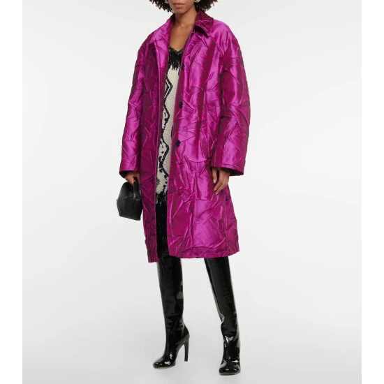 The easiest way to dress up any look is with a statement coat. This Dries Van Noten design is made from cloqué, a textued jacquard with a trompe l’oeil crinkled effect in bold fuchsia color.