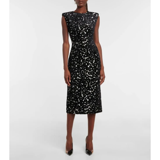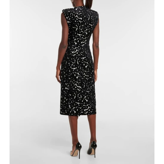 Dries van Noten demonstrates how to make animal prints sophisticated with this leopard-patterned midi dress. Featuring a fitted silhouette and padded shoulders, the piece is made from a cotton blend with velvet patches on a silver twill weave.