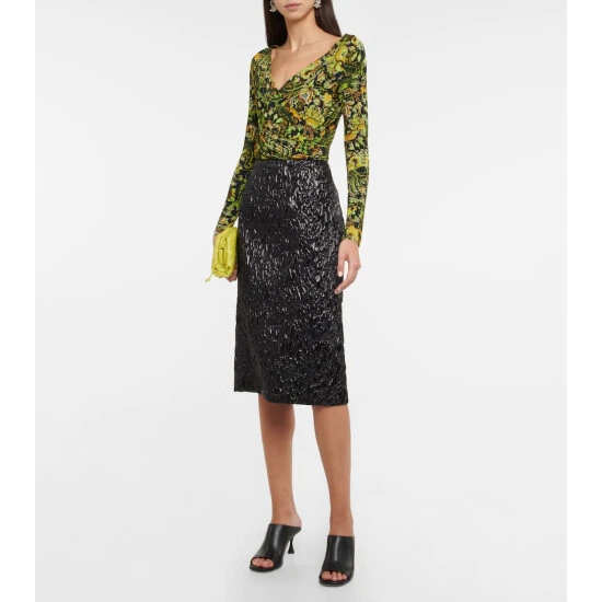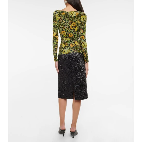 In line with Dries Van Noten’s signature aesthetic, this top features vibrant florals in a ‘70s wallpaper print. Made from stretchy jersey, it sculpts the figure with a ballerina neckline and gathering at one side.