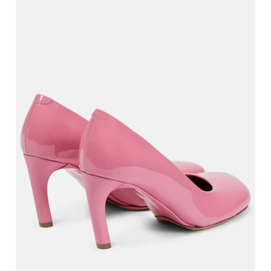 These pumps from Dries Van Noten are made from pink leather with a patent finish. They have squared open toes and slanted heels.