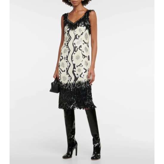 This disco ball of a dress is hand-embroidered with sequins in a snakeskin pattern with beaded fringing. Like all of Dries Van Noten’s pieces, the mesh style is designed for those who like to stand out.